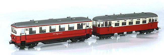 PANIERs H0e-/H0m-Dampftriebwagen-Modelle: links der Bleckeder Wagen, der als DT 2 - DT 4, später als DT 1 - DT 3 den Einwohnern des ehemaligen Kreises Bleckede (heute Kreis Lüneburg) Bewegungsfreiheit gab, rechts der DWss 1 der K.W.St.E., der als DT 203 bei der Jagsttalbahn seine Karriere beendete