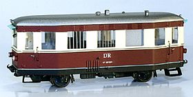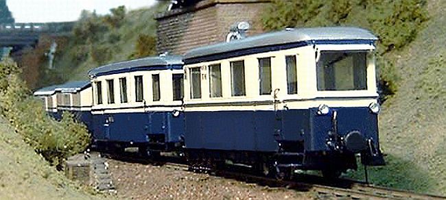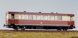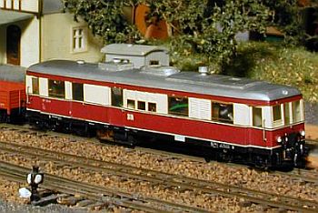 Die (im Vergleich zum PANIER-Foto) andere Seite präsentiert uns hier der Epoche-III-Triebwagen DR 187 025, den die LOK-SCHLOSSEREI (Bernd Schlosser in Dietlas/Thüringen) anbietet. Nein, er konkurriert nicht mit den PANIER- und Weinert-Modellen: Schlosser baut das Modell für die Baugrößen TTm und Nm. Die Wahl zwischen Bausatz und Fertigmodell liegt bei Ihnen - und: "Das Modell ist aus Messing gefertigt, die Lackierung wird durch Klebefolien vereinfacht" (Zitat Infotext Schlosser). (Modellfoto: LOK-SCHLOSSEREI) | ![]() |