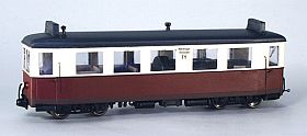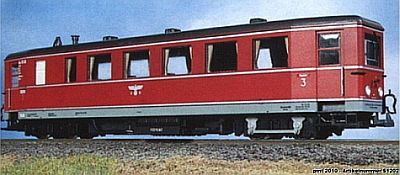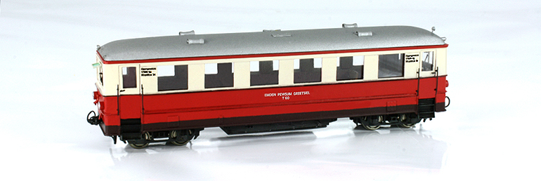 | Mit dem typischen Gotha-Gesicht - das sich auf den Fotos rechts nur erahnen lässt - lügt der T1 der Gernrode - Harzgeroder Eisenbahn uns etwas vor: Tatsächlich stammt er von der Waggonfabrik Dessau. Motorisiert mit 65 Diesel-PS, die über ein mechanisches Getriebe an nur eine Achse übertragen wurden, versah der mit immerhin 34 Sitzplätzen bestuhlte Triebwagen in Fahrplanrandlagen den Personenzugdienst. Trotz betrieblicher Bewährung beschaffte die GHE das Baumuster nicht nach. Dank glücklicher Umstände - der Triebwagen erlebte das Kriegsende in Eisfelder Talmühle und wurde flink nach Wernigerode verbracht - fiel der T1 nicht in das Reparationsgut der Selketalbahn. Als VT 133 522 setzte der Kleine seine Karriere nach dem Krieg bei der DR fort, die ihn Ende der 1950er Jahre aus dem Personenzugbetrieb zurückzog und ihn 1963 zu einem selbstfahrenden Gerätewagen (DR 187 001) umbaute. 1978 - 1989 überdauerte er abgestellt, bevor er in jenem Jahr erstmals als betriebsfähiges Museumsfahrzeug GHE T1 hergerichtet wurde. Dabei wurde allerdings der Innenraum nicht mit historischem Gestühl versehen. Sonder- und Charterverkehre waren fortan seine Domäne, 2001 erhielt er einen 125 PS starken Dieselmotor implantiert. 2008 - 2010 erneut gründlich aufgearbeitet steht er jetzt wieder im Dienst. PANIER bedient H0e- und H0m-Interessenten mit allen Varianten. | ![]() Oben: GHE T1, unten: Gerätewagen DR 187 001 (Modellfotos [2]: PANIER, copyright carocar.com) ![]() |