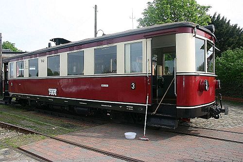 ![]() | T42 des DEV wird am Morgen des 01.05.2012 für den Betriebseinsatz noch ein wenig sauberer gemacht. Der Triebwagen wurde 1939 fabrikneu von der Waggonfabrik Dessau an die Franzburger Kreisbahnen geliefert und wurde zunächst als T2, später unter der Nummer Pommersche Landesbahnen 1124 geführt. Nach Übernahme der Franzburger Kreisbahnen durch die DR führte er die Kennzeichnung VT 137 532 und versah, 1958 remotorisiert, weiterhin bis zur Einstellung der Bahn seinen Dienst auf der Stammstrecke. Er wurde 1971 ausgemustert und kam 1974 zum DEV. Dort ist er regelmäßig im Einsatz zu erleben. T42 gehört zu einer Serie von vier baugleichen Wagen. |