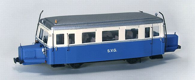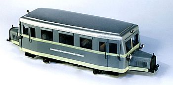 | In schicker blau-elfenbeinfarbener Lackierung kommt das PANIER-Modell des S.V.G. T 22 daher, eines ehemaligen Dienstfahrzeuges der Deutschen Luftwaffe: 1939 wurde der Schienenbus fabrikneu bei der Fliegerhorstkommandantur Hörnum auf Sylt in Dienst gestellt (rechts: PANIER-Modell in fliegergrau), und er trat 1949 seinen Friedensdienst bei der Sylter Inselbahn AG, später Sylter Verkehrsgesellschaft, an, der bis zur Streckeneinstellung anno 1970 dauerte. PANIER bietet diese interessanten Sonderlinge als Fertigmodelle und als „Halb-Bausätze“ für die Spurweiten H0e und H0m an, deren Gehäuse bereits fertig lackiert und beschriftet sind. (Fotos [2]: PANIER, copyright carocar.com) | ![]() |